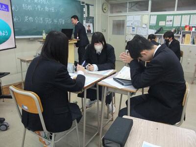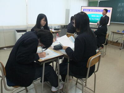 11月19日(水)の5時間目・6時間目に、紋別市で税理士をされている渡邊直喜先生をお招きして租税教室を実施しました。前半は渡邊先生から税に関する講義を受け、後半は財政案について考えるグループワークに取り組みました。3グループに分かれて財政案をまとめ、案のキャッチコピーも考えました。各グループ協力して一生懸命考えている様子が見られました。